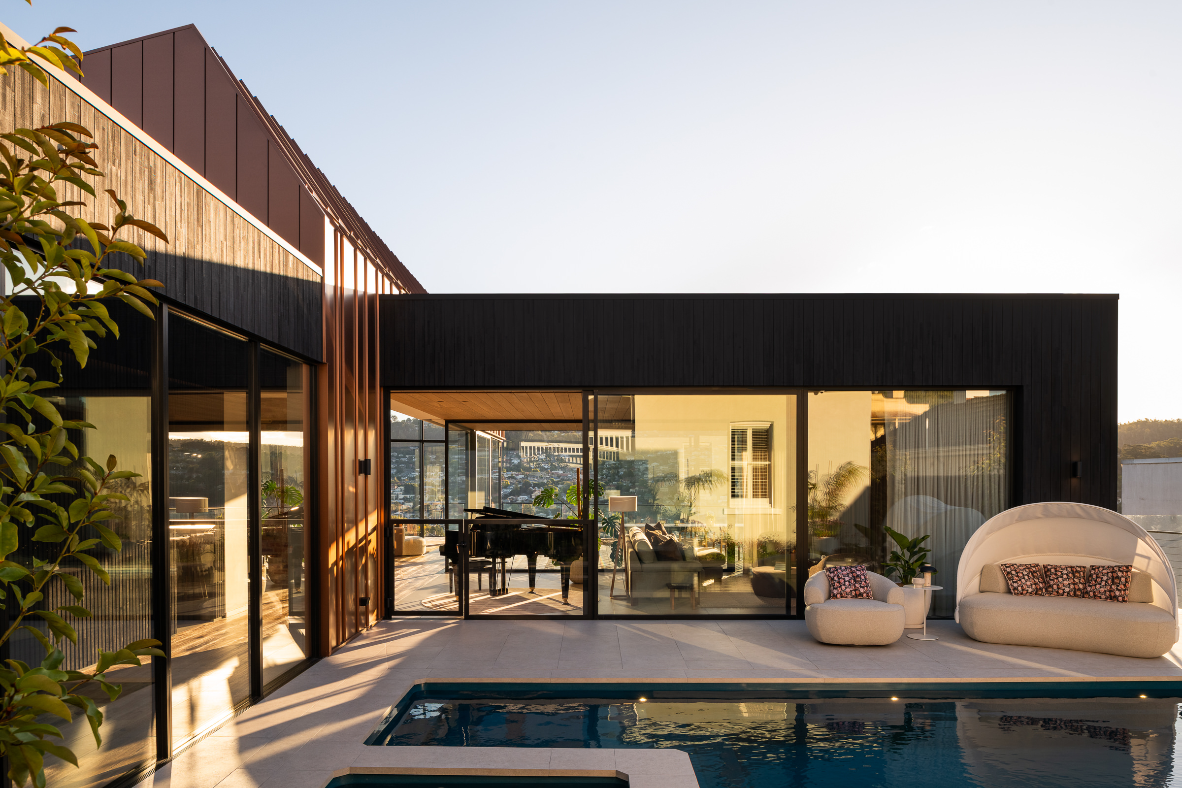 - Brushed copped structuur wraps up and over the high porter frame surrounded be black timber cladding in either side
